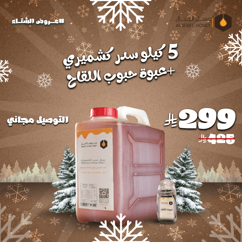 كما يتوفر عرض عسل سدر كشميري 10 كيلو مع ربع كيلو حبوب لقاح بشحن مجاني وبخصم 30% بسعر 599 ريالاً [انقر هنا].