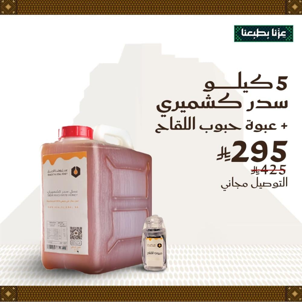 كما يتوفر عرض عسل سدر كشميري 10 كيلو مع ربع كيلو حبوب لقاح بشحن مجاني وبخصم 30% بسعر 599 ريالاً [انقر هنا].